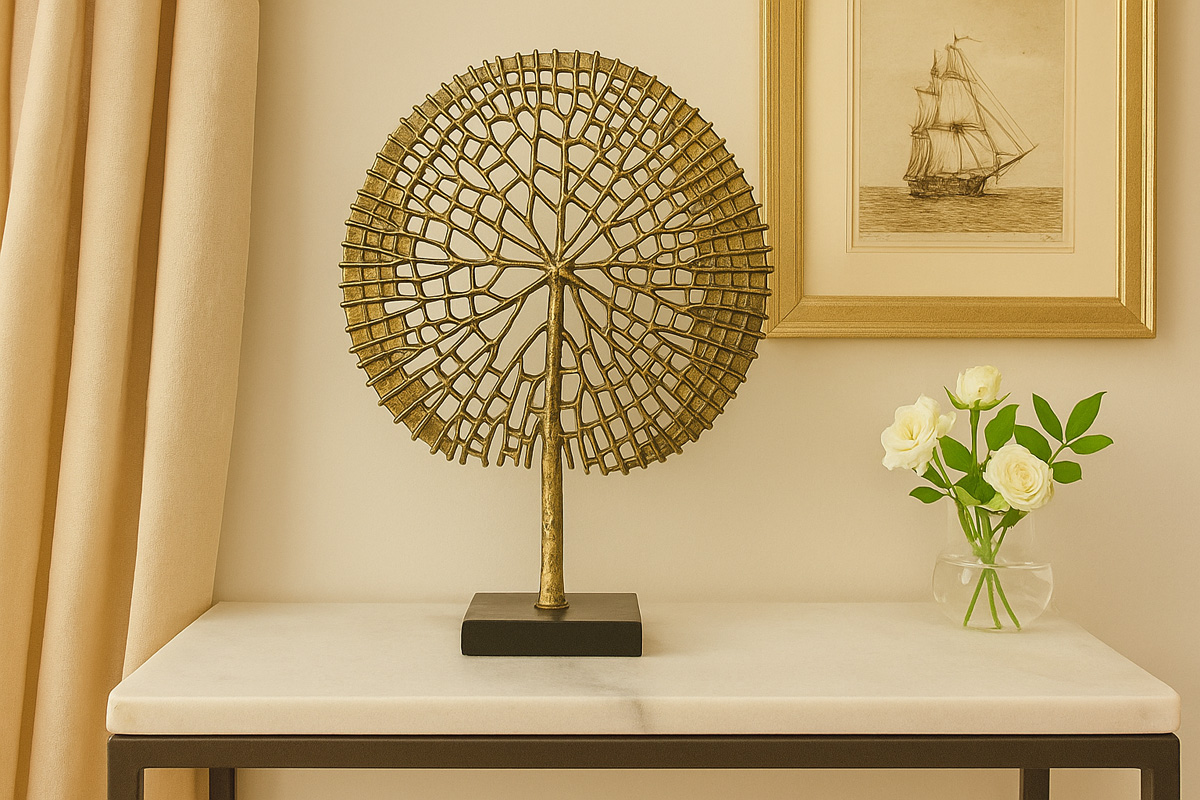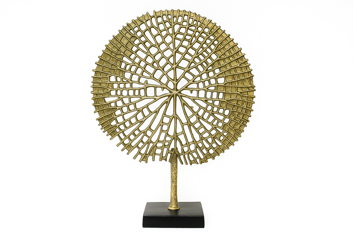 This striking decorative sculpture features an abstract tree form, meticulously crafted from metal with an antique gold finish. The intricate grid-like pattern radiates from the center, mimicking organic tree branches while maintaining a contemporary geometric aesthetic. Mounted on a sleek black base.