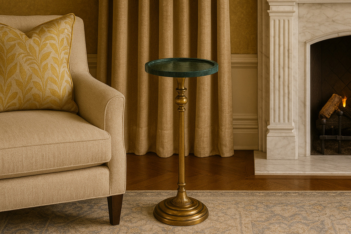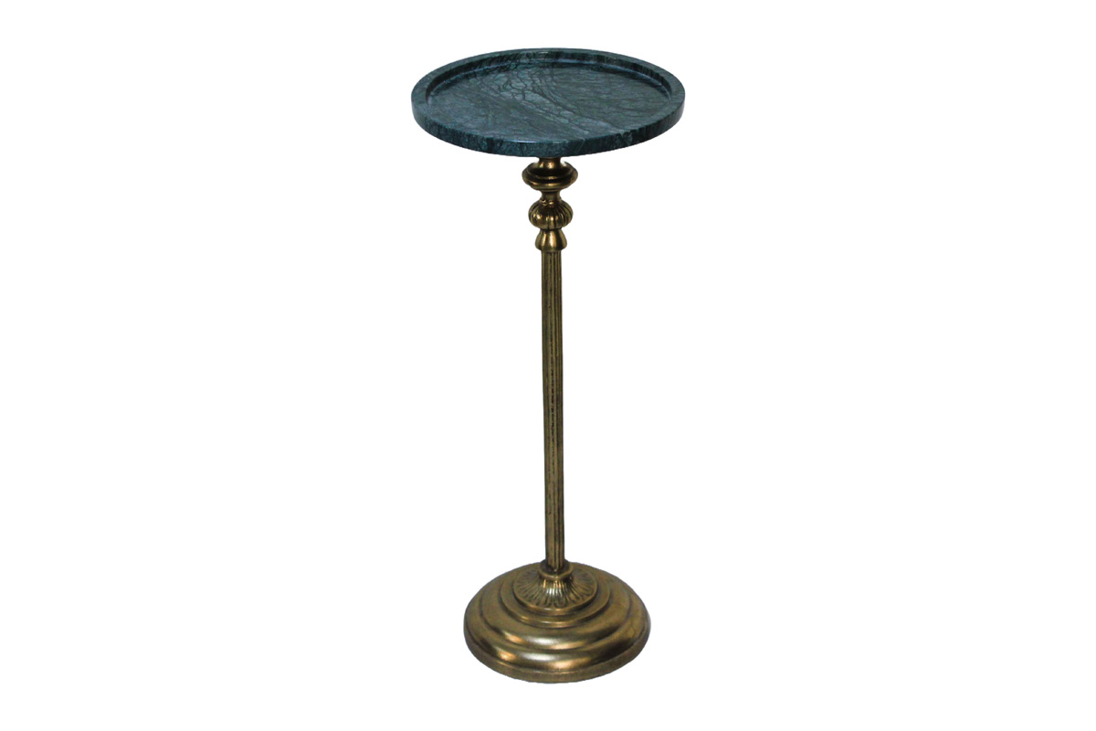 Bring a sense of vintage elegance to your space with this charming marble drink table, crafted for tasteful corners and intimate settings. The green round marble top is richly veined, exuding sophistication and refinement. Its ornate antique-brass finish pedestal base features classical detailing and a stepped round foot that enhances its timeless appeal.