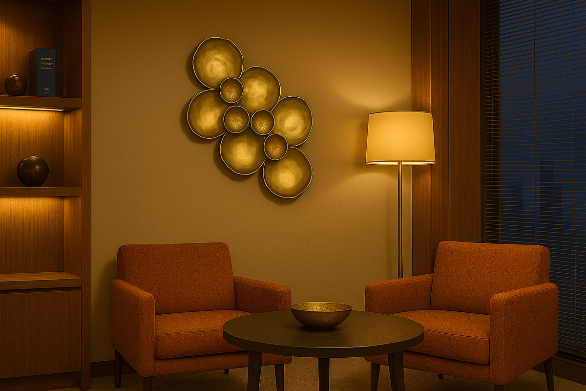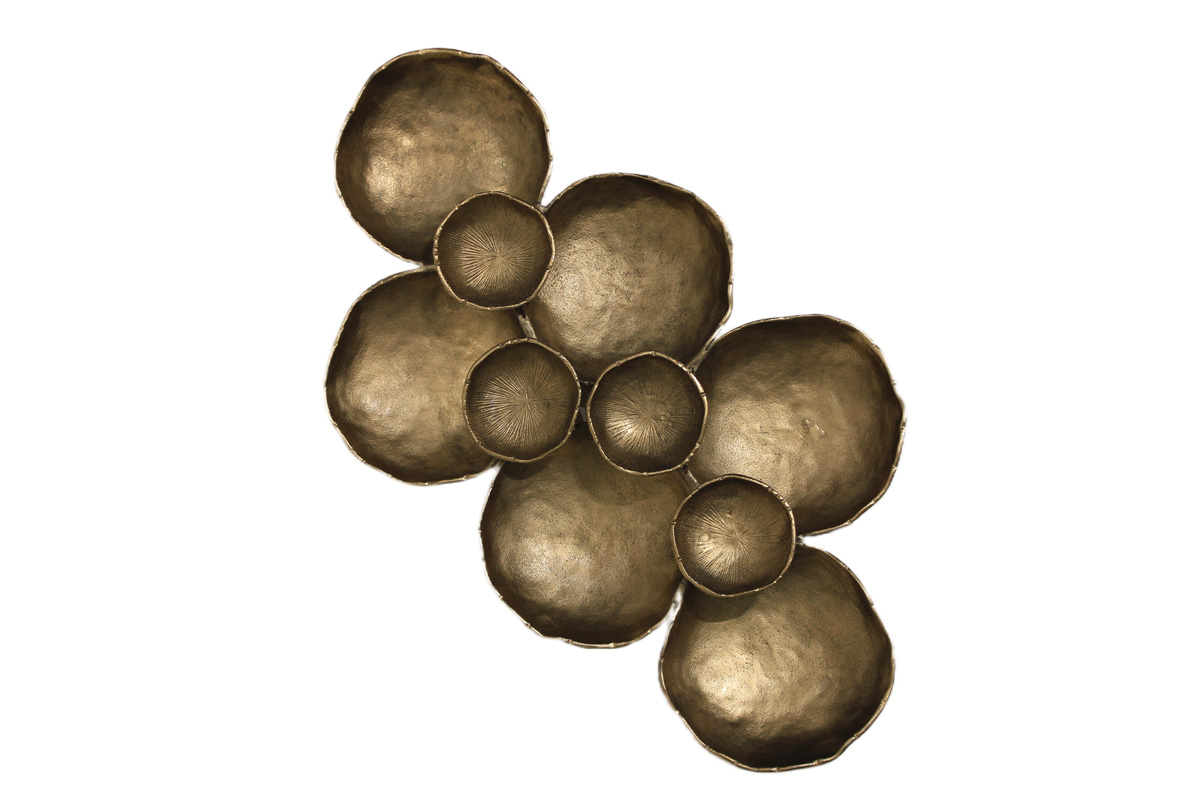 Aurum Bloom is a radiant wall art piece featuring a cluster of cast aluminium bowls, each detailed with a ridged texture that evokes the subtle beauty of nature. Finished in a rich Brass Antique tone, its layered, floral-inspired design brings warmth and sculptural depth to any space—be it a living room, office reception, or hallway. A perfect fusion of form and finish, this piece adds understated elegance with an artisanal edge.
