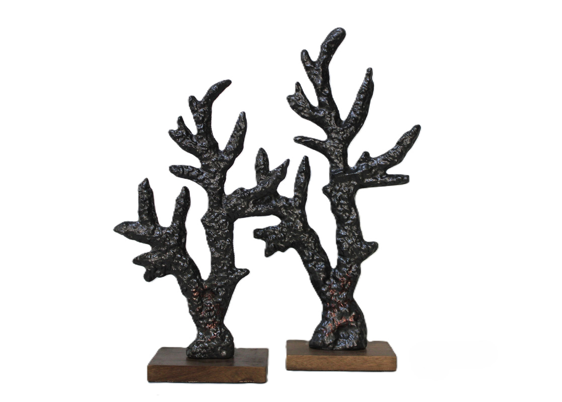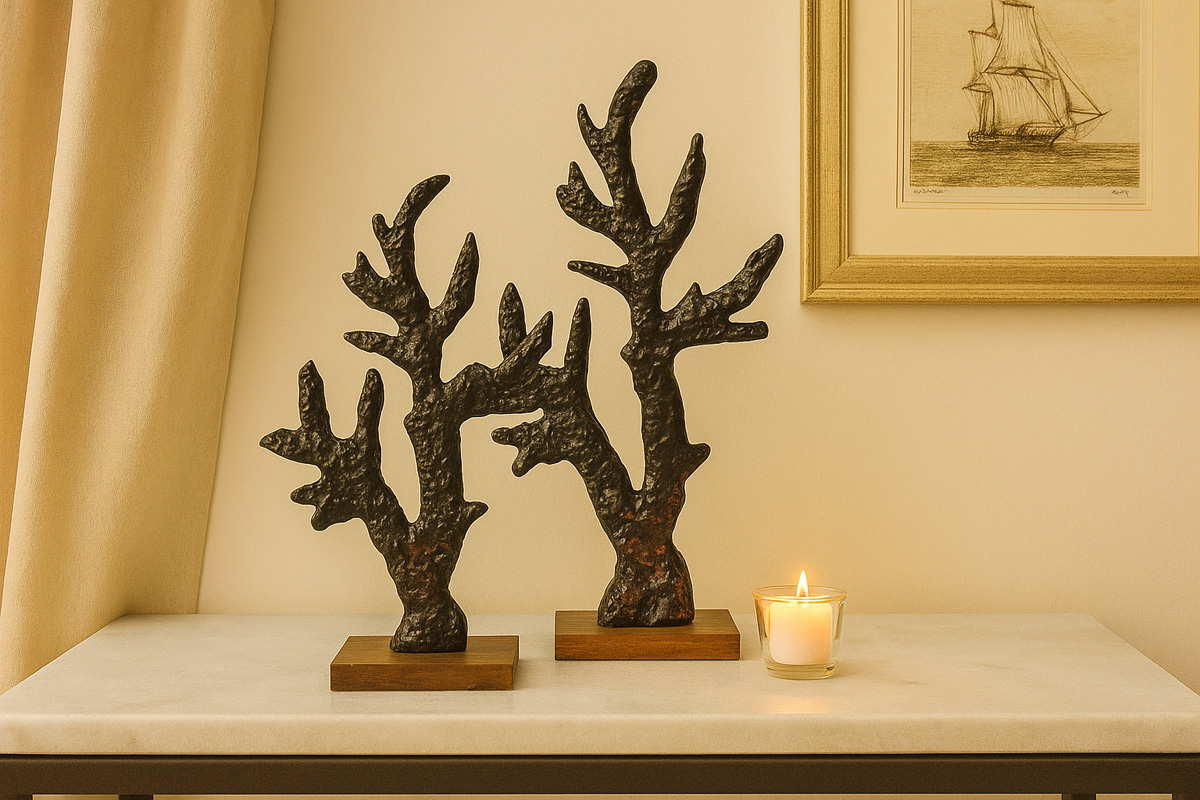 A dramatic duo of coral-inspired sculptures crafted in matte black metal. Their organic, branching forms mimic underwater textures, adding sculptural depth and modern artistry to any space. Ideal for console styling or shelves, they bring an earthy yet bold elegance with a minimalist edge.