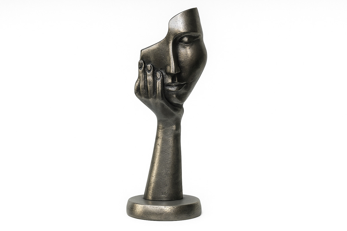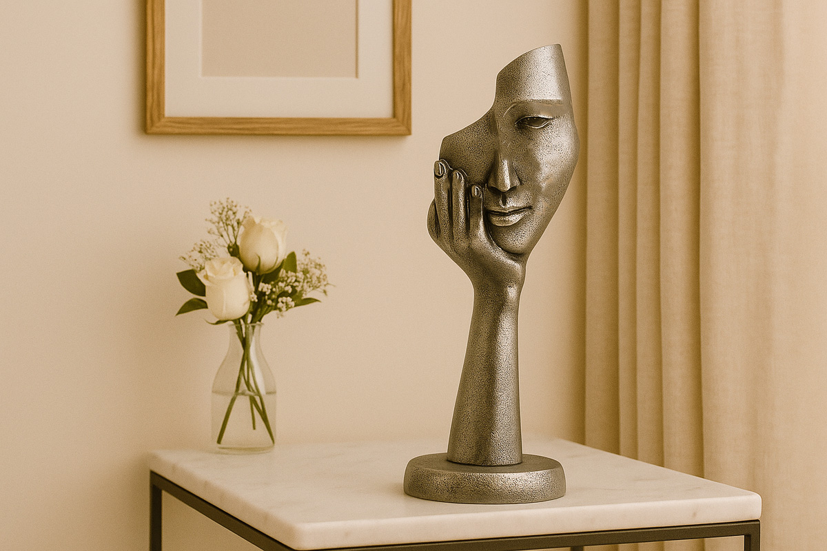 This striking sculpture, crafted in an antique silver finish, captures a moment of deep thought with its abstract half-face resting thoughtfully on a poised hand. A fusion of art and introspection, it makes a powerful statement piece for modern or classic interiors.