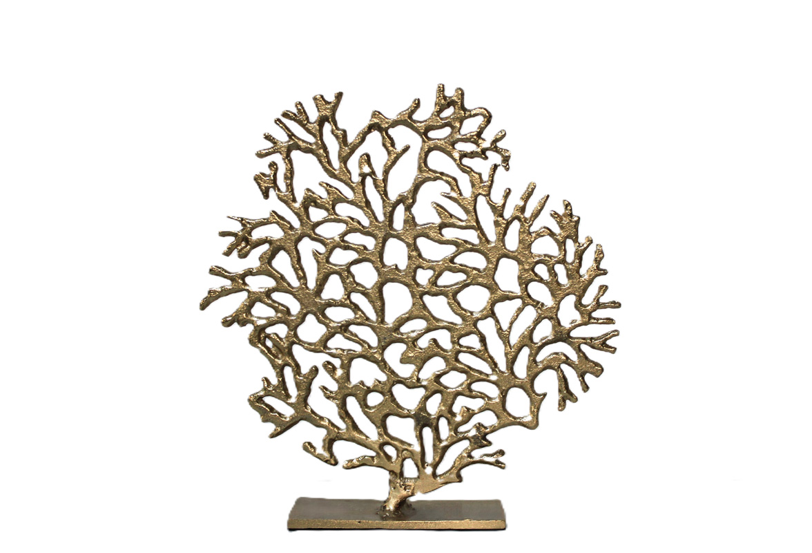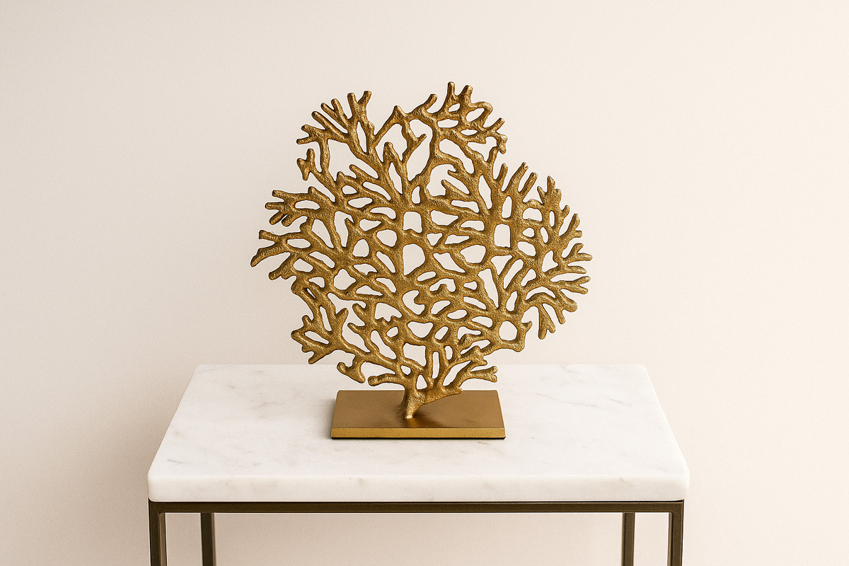 An artistic ode to nature, the Corra sculpture captures the delicate complexity of coral in a bold, sculptural form. Crafted from metal and finished in a luxurious antique gold, its openwork design adds depth and dimension without overwhelming the space.