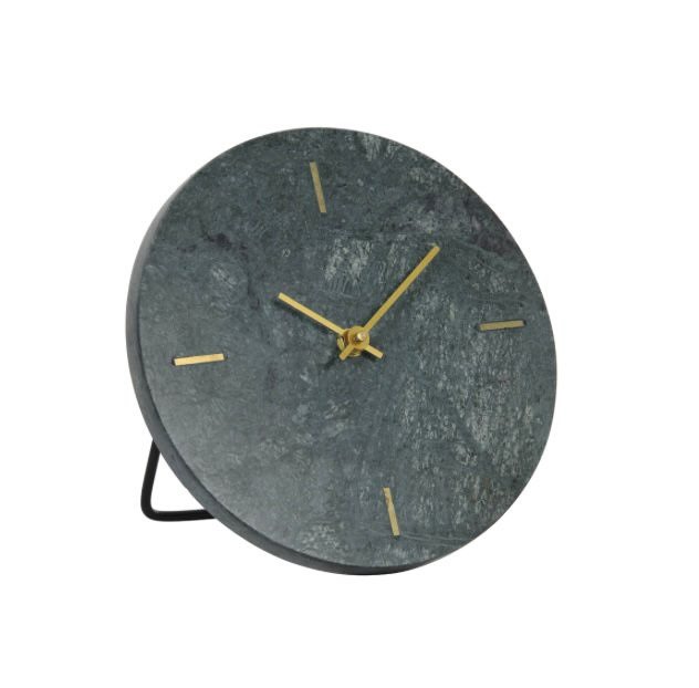 This sophisticated table clock features a rich green marble face, accented with four golden dashes and sleek golden hands for a touch of luxury. Supported by sturdy black iron stands—an eye-catching piece for any desk or shelf.