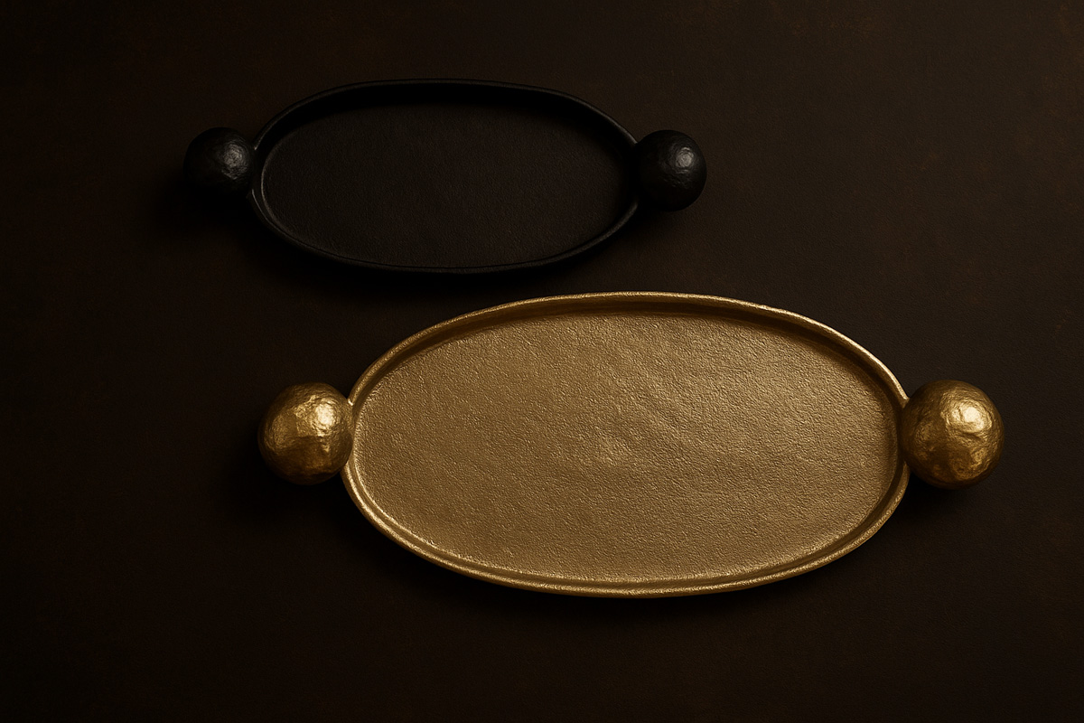 Elevate your serveware collection with the Orbis Dual Artisan Tray Set, featuring two meticulously handcrafted metal trays. The larger tray boasts a rich antique brass finish, while the smaller piece is finished in deep matte black—both designed with distinctive semi-spherical side handles for an artistic yet functional touch. Ideal for contemporary and eclectic spaces, these trays offer both visual impact and everyday utility, whether used for serving or as decorative centerpieces.