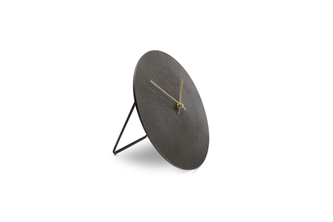 Crafted from cast aluminium with a ridged pattern, this versatile clock sits on a sleek metal stand and also features a back hook for wall mounting. Available in antique brass, silver, and black finishes, it’s perfect as both a table or wall clock.
